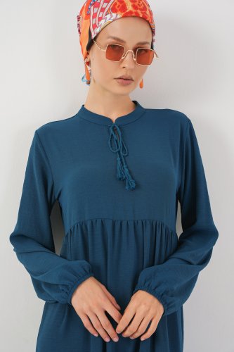 1627 Yaka Bağcıklı Tesettür Elbise Petrol