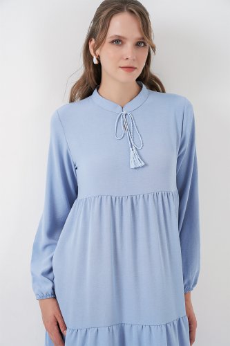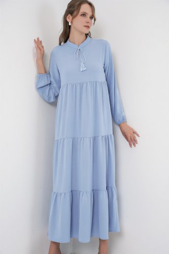 • T1627 Yaka Bağcıklı Elbise Koyu Mavi