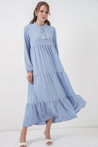 T1627 Yaka Bağcıklı Elbise Koyu Mavi