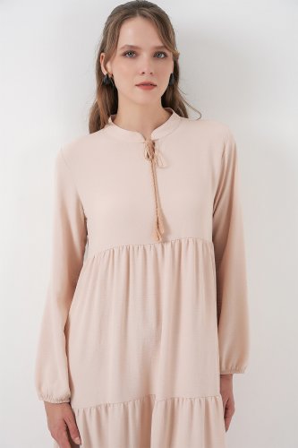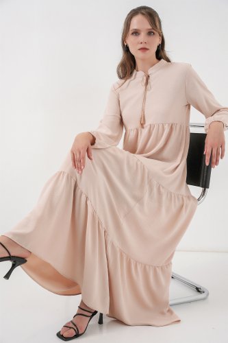 • T1627 Yaka Bağcıklı Elbise C Bej